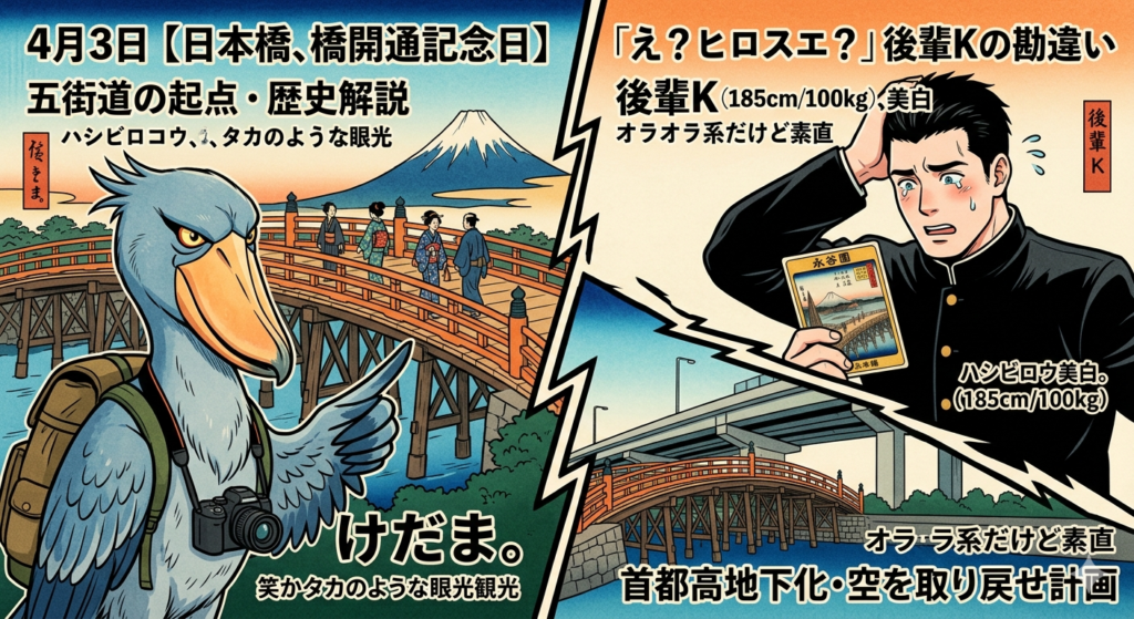 4月3日の「日本橋開通記念日」にちなみ、日本の道路の起点である日本橋の歴史を解説。歌川広重と葛飾北斎の浮世絵の違いや、現在進行中の「首都高地下化プロジェクト」による2040年の未来像まで、会話形式で楽しくお届けします。 -