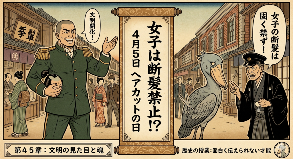 4月5日は「ヘアカットの日」。実は明治5年に「女子断髪禁止令」が出された日が由来だと知っていますか?なぜ男性は良くて女性はダメだったのか?黒船来航から始まる「見た目の近代化」という国家戦略と、現代にも通じる自由への葛藤を、ハシビロコウ(けだま。)が分かりやすく解説します! -
